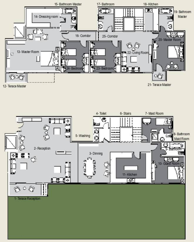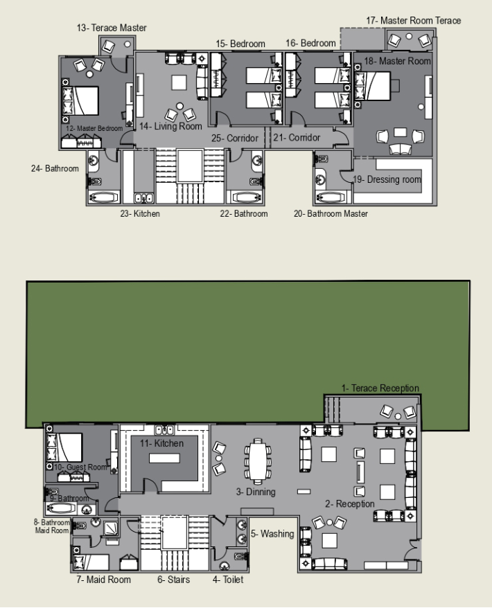 This two-level floor plan combines luxury and flexibility, with a clear separation of public and private areas, dual living spaces, multiple terraces, and a master suite with private amenities—ideal for multi-generational living and seamless indoor-outdoor flow.